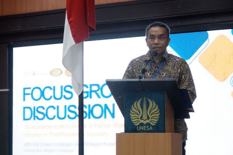 Dr. Sujarwanto, M.Pd., Wakil Rektor Bidang Perencanaan dan Kerja Sama menyampaikan sambutan rektor. Dia mengatakan, di samping meningkatkan kualitas akademik, UNESA juga menjalin banyak kerja sama di berbagai sektor baik di dalam maupun di luar negeri untuk maksimalisasi MBKM.