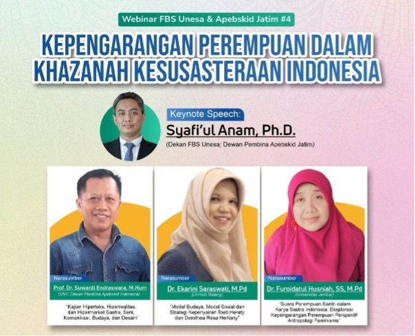 Unesa.ac.id., SURABAYA—Fakultas Bahasa dan Seni (FBS), Universitas Negeri Surabaya (Unesa) bekerja sama dengan Afiliasi Pengajar, Peneliti Budaya, Bahasa, Sastra, Komunikasi, Seni, dan Desain (Apebskid) Jawa Timur ...