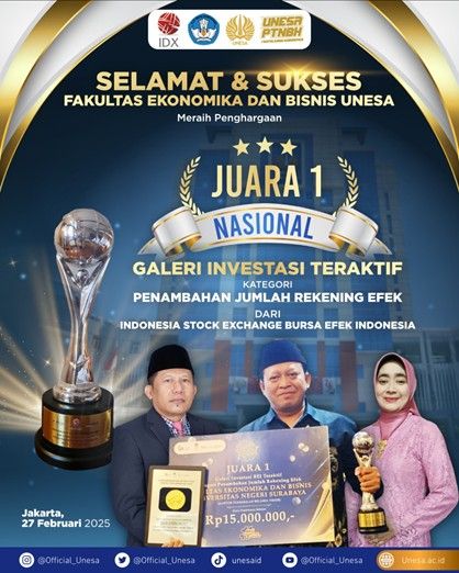 Unesa.ac.id. SURABAYA—Fakultas Ekonomika dan Bisnis (FEB) Universitas Negeri Surabaya (Unesa) kembali menorehkan penghargaan tingkat nasional. Terbaru, FEB meraih juara 1 nasional dalam ajang Penghargaan Galeri Investasi ...