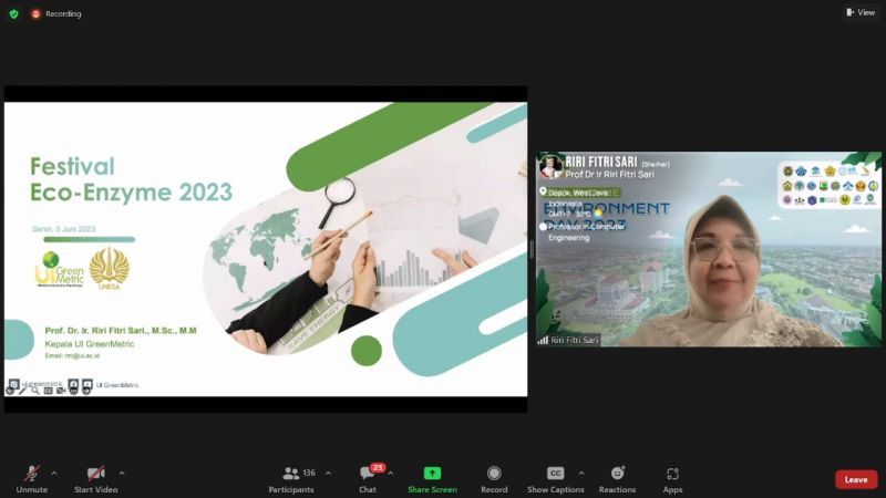 Ketua ekoenzim UI Greenmetric, Dr. Ir. Nurzainah Ginting, M.Sc. menyampaikan apresiasi terima kasih atas partisipasi UNESA dan 21 perguruan tinggi lain. Pada festival kali ini disaksikan secara penuangan eco-nzyme di semua perguruan tinggi mitra serentak. Ia berharap kedepannya banyak perguruan tinggi yang ikut berpartisipasi dalam melanjutkan pelestarian lingkungan hidup secara berkelanjutan.