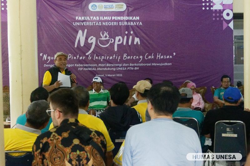 Unesa.ac.id, SURABAYA–Dalam rangka peningkatan kebersamaan, sinergi dan kolaborasi untuk mendukung transisi UNESA PTNBH, Fakultas Ilmu Pendidikan (FIP) gelar ‘Ngobrol Pintar dan Inspiratif (Ngopi-In) Bareng Cak Hasan’ pada 3 Maret 2023 di Pendopo Ki Hajar Dewantara, Kampus Lidah Wetan, Surabaya.
