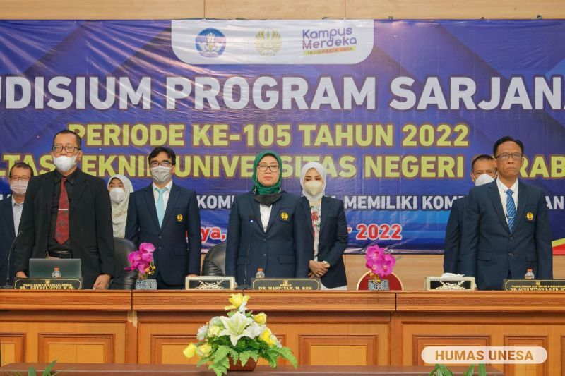 Unesa.ac.id, SURABAYA-Fakultas Teknik mengukuhkan sekitar 247 lulusan sarjana pada Yudisium yang diselenggarakan di Auditorium, Universitas Negeri Surabaya (UNESA) Kampus Ketintang pada Rabu, 8 November 2022. Acara ini mengusung tema “Yudisiawan/Yudisiawati Siap Berkompetisi serta Memiliki Kompetensi dan Adaptif”.