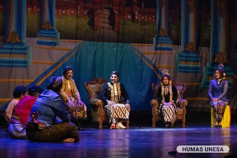 Unesa.ac.id, SURABAYA--Universitas Negeri Surabaya helat pagelaran ludruk Lakon ‘Babad Surabaya’ di Gedung Pertunjukan Sawunggaling pada 19 Agustus 2023. Diiringi musik tradisional, pementasan teater yang disutradarai Direktur Seni dan Budaya, Dr. Trisakti, M.Si., dan Yohan Susilo, S.Pd., M.Pd., itu dihadiri bintang tamu; Jo Klitik dan Jo Klutuk.