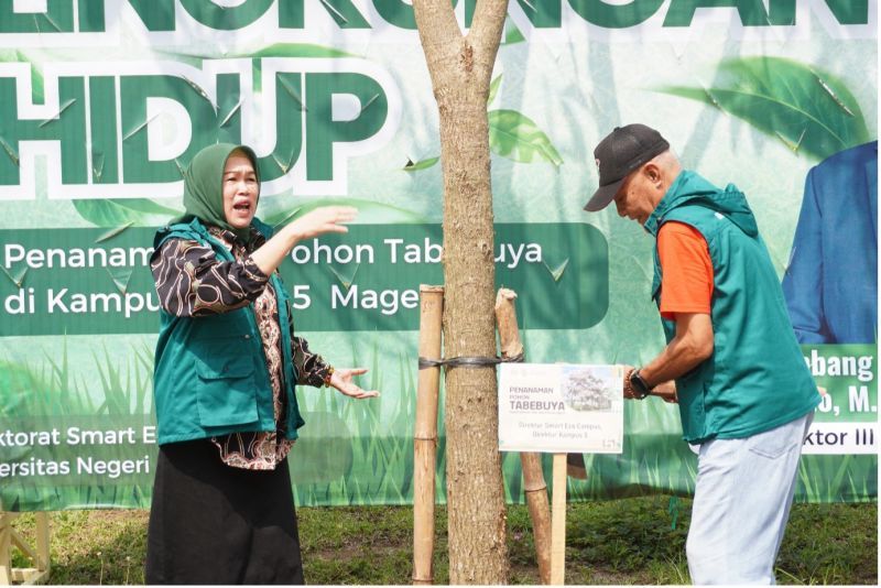 Unesa.ac.id. MAGETAN—Dalam rangka memperingati Hari Lingkungan Hidup Sedunia, Universitas Negeri Surabaya (Unesa) Kampus 5 Magetan bersama jajaran Pemkab atau Forkopimda Magetan melakukan giat penanaman pohon tabebuya di kawasan Unesa 5 Magetan, pada Rabu, 11 Juni 2o25.